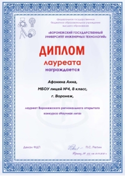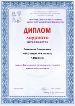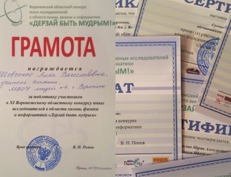 Как найти формулу успеха? 16 ноября 2019 г. 4 учащихся 9-10 классов под руководством учителя химии ВКК Шевченко А.В. принимали участие в заключительном этапе Региональной олимпиады по химии учащихся средних школ и учреждений СПО «Формула успеха». Организаторами и партнерами Олимпиады, кроме ФГБОУ ВО «ВГУИТ», департамента образования, науки и молодежной политики Воронежской области, Воронежской площадки компании «СИБУР» выступили и Ассоциация учителей и преподавателей химии Воронежской области», ООО «Вектор Полимир», компания «Молвест», Воронежский шинный завод (компания Pirelli). В этом году в отборочном этапе Региональной олимпиады по химии «Формула успеха» приняли участие более 250 учащихся 6-11 классов средних школ, гимназий, лицеев и студенты 1-3 курсов организаций среднего профессионального образования. География участников представлена не только школьниками и студентами Воронежской, но и Белгородской, Курской, Липецкой и Тамбовской областей. Все учащиеся нашего лицея прошли отборочный этап и стали финалистами олимпиады. В заключительном этапе они выполняли задания теоретического тура. Участники соревновались в решении теоретических задач, а также проверили свои знания на практике. В практическом туре девятиклассники изготавливали помадные конфеты и варили мыло; ребята из 10 класса выполняли практическую работу по теме: «Определение кислотности пищевых продуктов». По результатам олимпиады учащийся 10 «А» класса Гусев Иван стал призером (3 место в конкурсной группе – 10 класс); Грушевская Оксана (10 «А» класс) и Рубанская Полина (9 «А» класс) стали лауреатами в специальных номинациях жюри («Биологическая химия» и «Пищевая химия»). Все ребята были отмечены дипломами и ценными подарками. Почетной грамотой была награждена учитель химии Шевченко А.В |