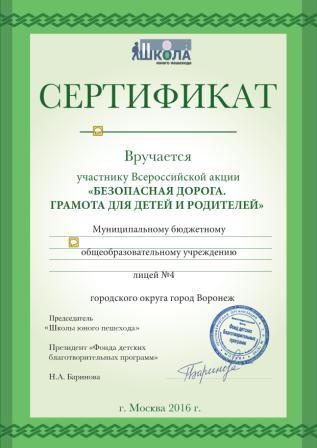 Сохранение жизни и здоровья юных участников дорожного движения имеет социальные, психологические, правовые, нравственные, эстетические и педагогические аспекты. Профилактика травматизма детей возможна не только при условии их специальной подготовленности к безопасной жизнедеятельности в транспортной среде, но и к формированию у них высокого уровня транспортной культуры. Для улучшения положения на дорогах необходима пропаганда ПДД в учебных заведениях на разных уровнях. В нашем лицее в конце сентября прошли родительские собрания, посвященные профилактике правонарушений и правилам соблюдения ПДД нашими учащимися. Также ребята приняли активное участие во всероссийской акции«Безопасная дорога. Грамота для детей и родителей». Получен сертификат участия за проведение родительских собраний и работу с учащимися http://detibdd.ru/ |