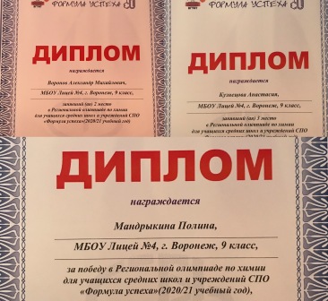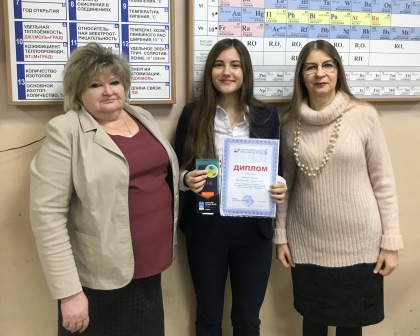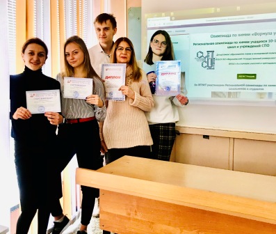 Как найти формулу успеха? 16 ноября 2019 г. 4 учащихся 9-10 классов под руководством учителя химии ВКК Шевченко А.В. принимали участие в заключительном этапе Региональной олимпиады по химии учащихся средних школ и учреждений СПО «Формула успеха». Организаторами и партнерами Олимпиады, кроме ФГБОУ ВО «ВГУИТ», департамента образования, науки и молодежной политики Воронежской области, Воронежской площадки компании «СИБУР» выступили и Ассоциация учителей и преподавателей химии Воронежской области», ООО «Вектор Полимир», компания «Молвест», Воронежский шинный завод (компания Pirelli). В этом году в отборочном этапе Региональной олимпиады по химии «Формула успеха» приняли участие более 250 учащихся 6-11 классов средних школ, гимназий, лицеев и студенты 1-3 курсов организаций среднего профессионального образования. География участников представлена не только школьниками и студентами Воронежской, но и Белгородской, Курской, Липецкой и Тамбовской областей. Все учащиеся нашего лицея прошли отборочный этап и стали финалистами олимпиады. В заключительном этапе они выполняли задания теоретического тура. Участники соревновались в решении теоретических задач, а также проверили свои знания на практике. В практическом туре девятиклассники изготавливали помадные конфеты и варили мыло; ребята из 10 класса выполняли практическую работу по теме: «Определение кислотности пищевых продуктов». По результатам олимпиады учащийся 10 «А» класса Гусев Иван стал призером (3 место в конкурсной группе – 10 класс); Грушевская Оксана (10 «А» класс) и Рубанская Полина (9 «А» класс) стали лауреатами в специальных номинациях жюри («Биологическая химия» и «Пищевая химия»). Все ребята были отмечены дипломами и ценными подарками. Почетной грамотой была награждена учитель химии Шевченко А.В |