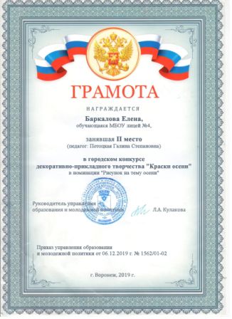 Поздравляем с победой в городском конкурсе декоративно-прикладного творчества «Краски осени» в номинации «Рисунок на тему осени» учащуюся 9 «Г» класса Баркалову Елену (2 место), учащуюся 8 «Г» класса Глебову Дарину (3 место) под руководством учителя изобразительного искусства Потоцкой Г.С. Достойная победа! Молодцы! |
